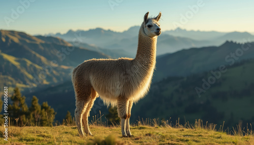 Obraz premium Tall llama standing mountain hillside golden hour with rolling green valley...