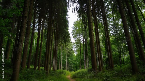 Fototapeta premium Tall majestic trees creating a tranquil path through a vibrant lush green...