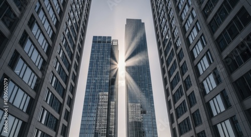 Fototapeta premium Tall modern skyscrapers create a dramatic canyon effect against bright...