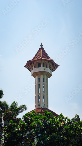 © Hidayat, Fototapeta premium Tall mosque tower with traditional red tiled roof, surrounded by lush green trees under a clear blue sky.