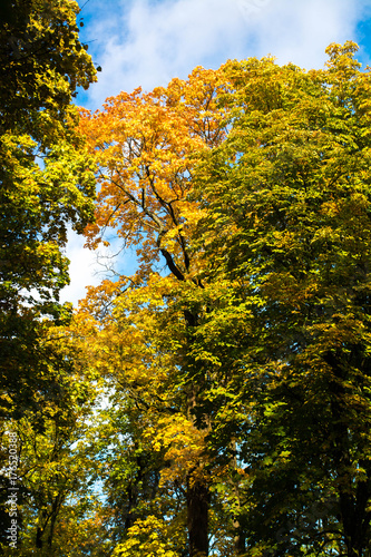 Fototapeta premium Tall old trees on blue cloudy sky background. Yellow and green leaves.