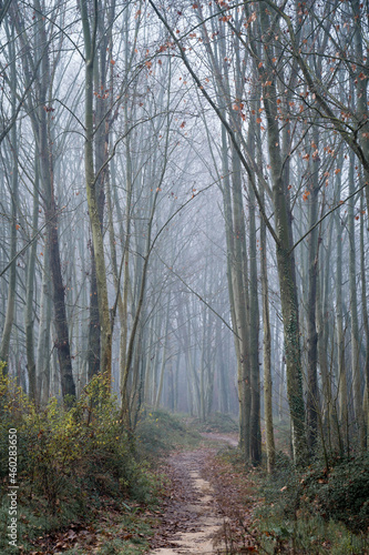 © Diego, Fototapeta premium tall Oriental plane tree forest, road crossing and dense fog catalonia, spain