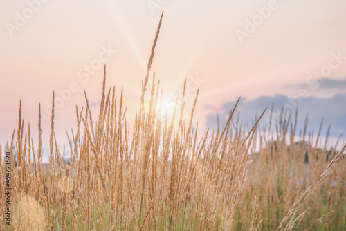 Fototapeta premium Tall ornamental grasses backlit by sunrise, sun flare, daytime, nobody
