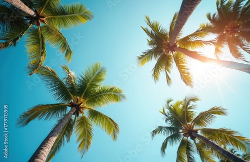 Naklejka premium Tall palm trees reach towards a clear blue sky on a bright, sunny day. Lush...