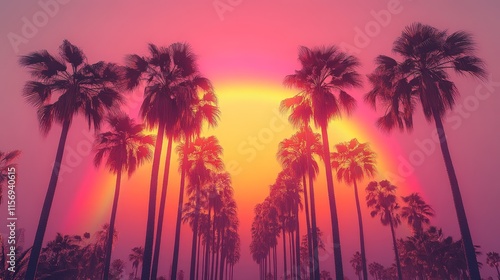 © gen_pick, Obraz premium Tall Palm Trees Under a Vibrant Rainbow Sky