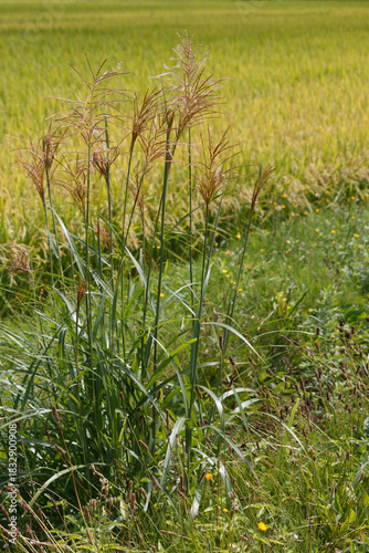 Fototapeta premium Tall pampas grass growing by a Japanese rice paddy in summer