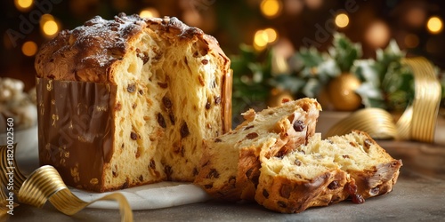 © MNStudio, Obraz premium Tall panettone loaf sliced open to show airy texture and raisins inside, surrounded by festive ribbons and warm Christmas lights. Traditional in Italy and Switzerland.