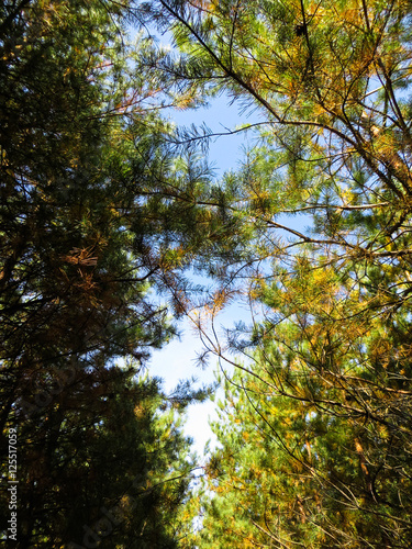 Obraz premium Tall pine trees in a forest. Looking up