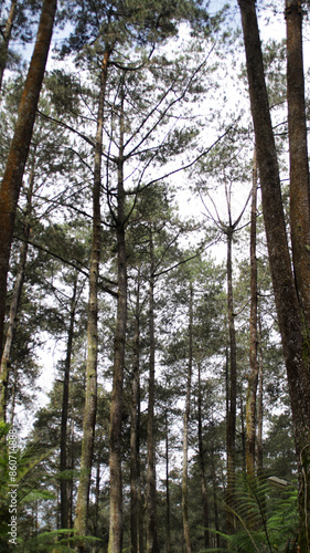 Obraz premium Tall pine trees in a lush green forest with a clear sky background in a serene natural setting