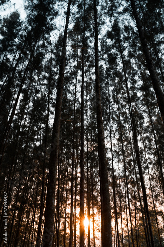 © Vajirawich, Fototapeta premium Tall Pine Trees In Forest During Sunset. silhouette pine trees with drawn sky.