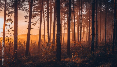 Naklejka premium Tall pine trees stand in a forest with a warm orange sunset casting a hazy glow through the mist nature