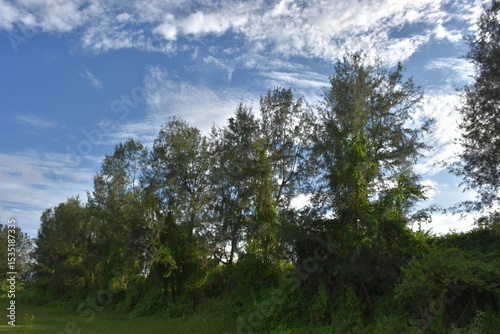 © Golam Rob, Obraz premium Tall pine trees under a bright blue sky with scattered clouds in a lush green landscape.