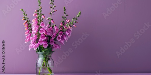 © Pixels , Fototapeta premium Tall pink foxgloves in a simple glass bottle, against a solid lavender background