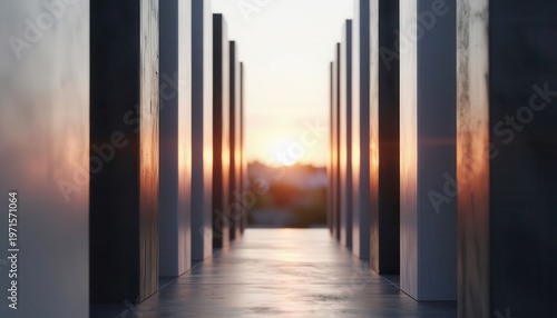 © maxximmm, Fototapeta premium tall, rectangular structures lined along a pathway, leading towards a sunset. The vibrant sunset casts shadows on the structures and illuminates the pathway.