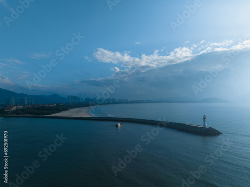 © lzf, Obraz premium Tall red and white striped lighthouse on seaside in morning sunlight. Blue sky with white clouds. Summer vacation, holiday at sea concept