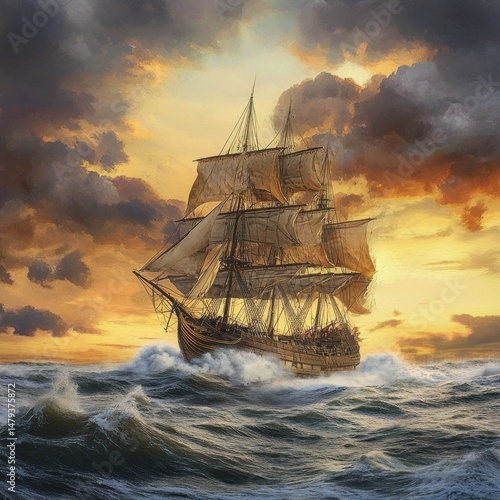 © DriftPixels, Fototapeta premium Tall ship sailing through rough ocean waves at sunset dramatic sky nautical vessel adventure maritime history