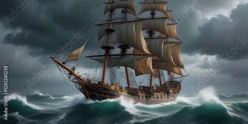 Fototapeta premium Tall ship sailing through rough seas in a stormy weather scene, sailing,...