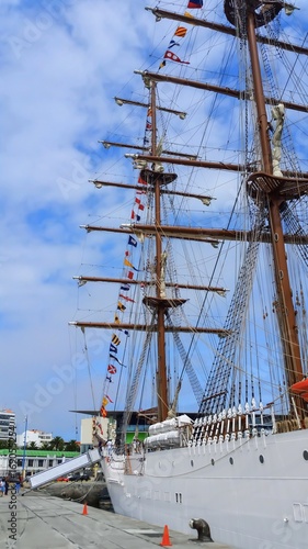 Fototapeta premium Tall ship with signal flags moored in the seaport