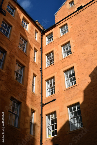 © eyepals, Naklejka premium Tall Stone Building & Windows seen from below against Blue Sky