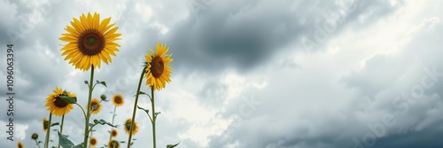 © Supharak wonginyoo, Fototapeta premium Tall sunflower stalks stand against a backdrop of a cloudy sky with dark grey clouds and a few wispy strands of cirrus, brown, landscape