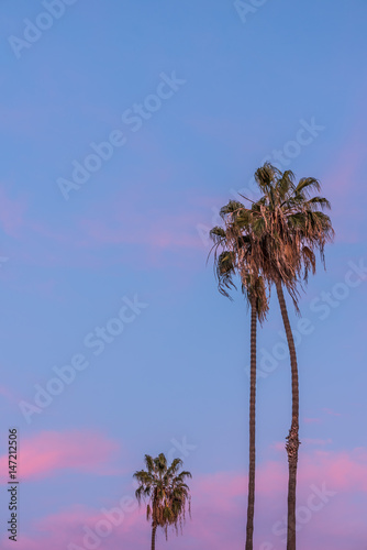Naklejka premium Tall thin three palm trees in California with purple pink sunset sky in...