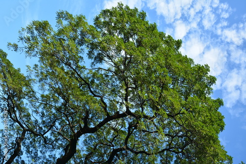 © WE_S, Fototapeta premium Tall tree green leaves growing on branches with clouds and sky