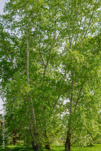 Obraz premium Tall tree trunks in the park. Perennial poplars. summer sunny day.