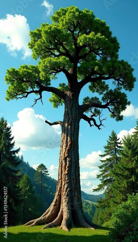 Naklejka premium Tall tree with gnarled trunk and branches stretching towards the sky, branch, forest, green