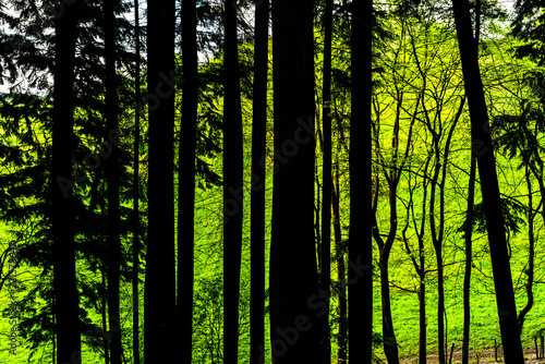 © mark, Fototapeta premium Tall trees backlit by bright green grass