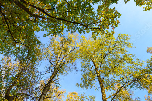 © vivoo, Obraz premium Tall trees forest viewed from below.