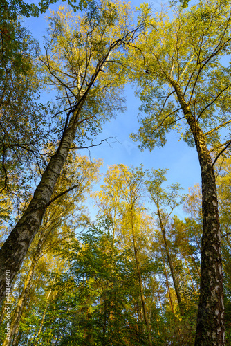 © vivoo, Fototapeta premium Tall trees forest viewed from below.