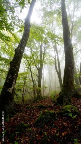 © Melisa, Fototapeta premium Tall Trees in a Misty, Mossy Deciduous Forest