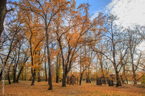 © Yuri Bizgaimer, Fototapeta premium Tall trees in autumn in a park