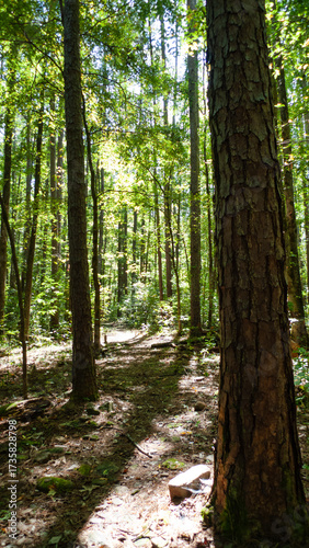© Tamara Harding, Fototapeta premium Tall trees in the forest with sunshine , loblolly pine in the foreground, Northwest Arkansas, Ozark mountains