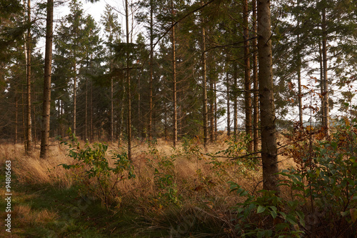 Fototapeta premium Tall trees in the grass in the forest at fall