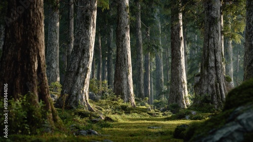 Obraz premium Tall trees line a path in a dense forest with sunlight filtering through the...