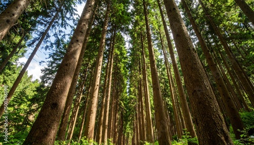 © Ana, Obraz premium Tall Trees Reach for the Sky in Lush Forest with Sunlight, and Nature Background.