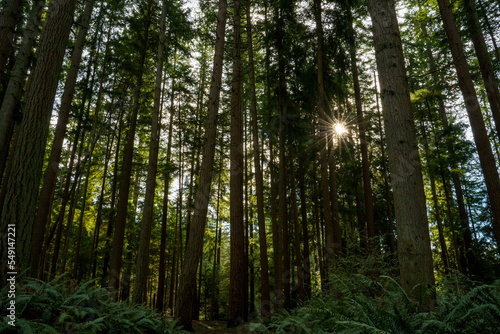 Fototapeta premium Tall trees stretch in the forest with the sun peeking through.