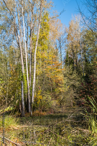 © Yi, Fototapeta premium tall trees surrounded pond filled with grasses under the blue sky displaying beautiful autumn colour