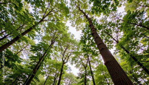 © Nattapol, Fototapeta premium Tall trees viewed from below in a lush green forest.