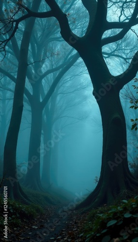 Naklejka premium Tall trees with gnarled branches and twisted trunks enveloped in mist, darkness, eerie