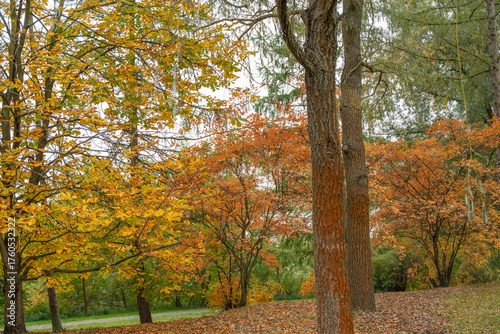 Naklejka premium Tall trees with orange and yellow foliage line a park path. The ground is...