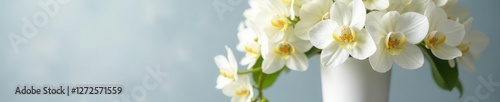 © Theerawat, Fototapeta premium Tall white vase, cascading white hydrangeas and orchids , cascade, table decor
