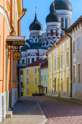 © Jevgeni Ivanov, Obraz premium Tallinn, Estonia - ‎25 ‎April ‎2020. Alexander Nevsky Church on the side of a small, colorful street in the old city. Medieval architecture of the country. Colorful buildings.