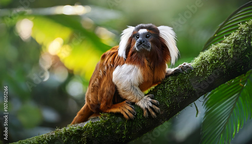 Naklejka premium Tamarin monkey perched on a branch in a vibrant tropical rainforest