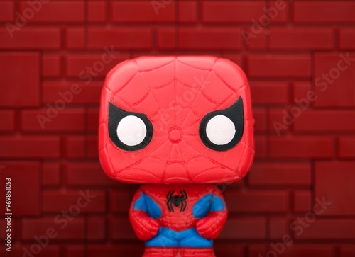 © rosinka79, Obraz premium Tambov, Russian Federation - August 23, 2024 Spider-Man Funko POP Mini Vinyl Figure against a red brick wall background.