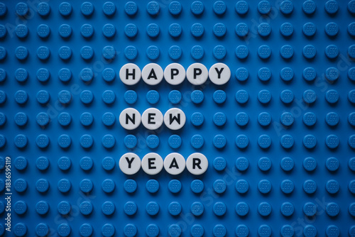 © Stepan Popov, Obraz premium Tambov, Russian Federation - December 06, 2025 The phrase Happy New Year on a blue Lego baseplate. The scene is made out of Lego dots.