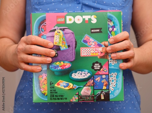 © rosinka79, Fototapeta premium Tambov, Russian Federation - December 27, 2023 Woman holding a Lego Dots box