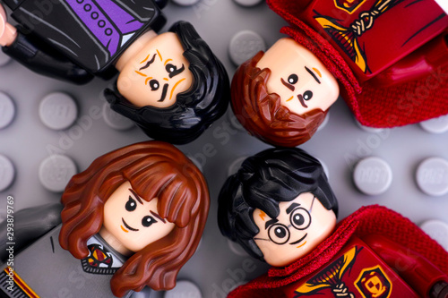 © rosinka79, Fototapeta premium Tambov, Russian Federation - January 06, 2019 Four Lego Harry Potter minifigures - Harry Potter, Hermione Granger, Severus Snape and Oliver Wood on gray background. Studio shot.