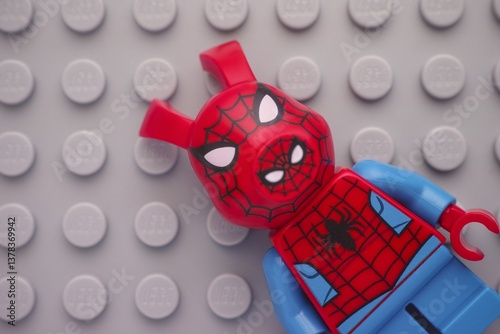 © rosinka79, Naklejka premium Tambov, Russian Federation - January 24, 2025 Lego Spider-Ham minifigure on a gray baseplate background